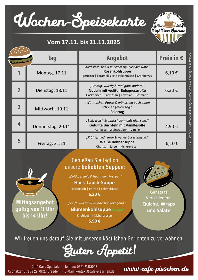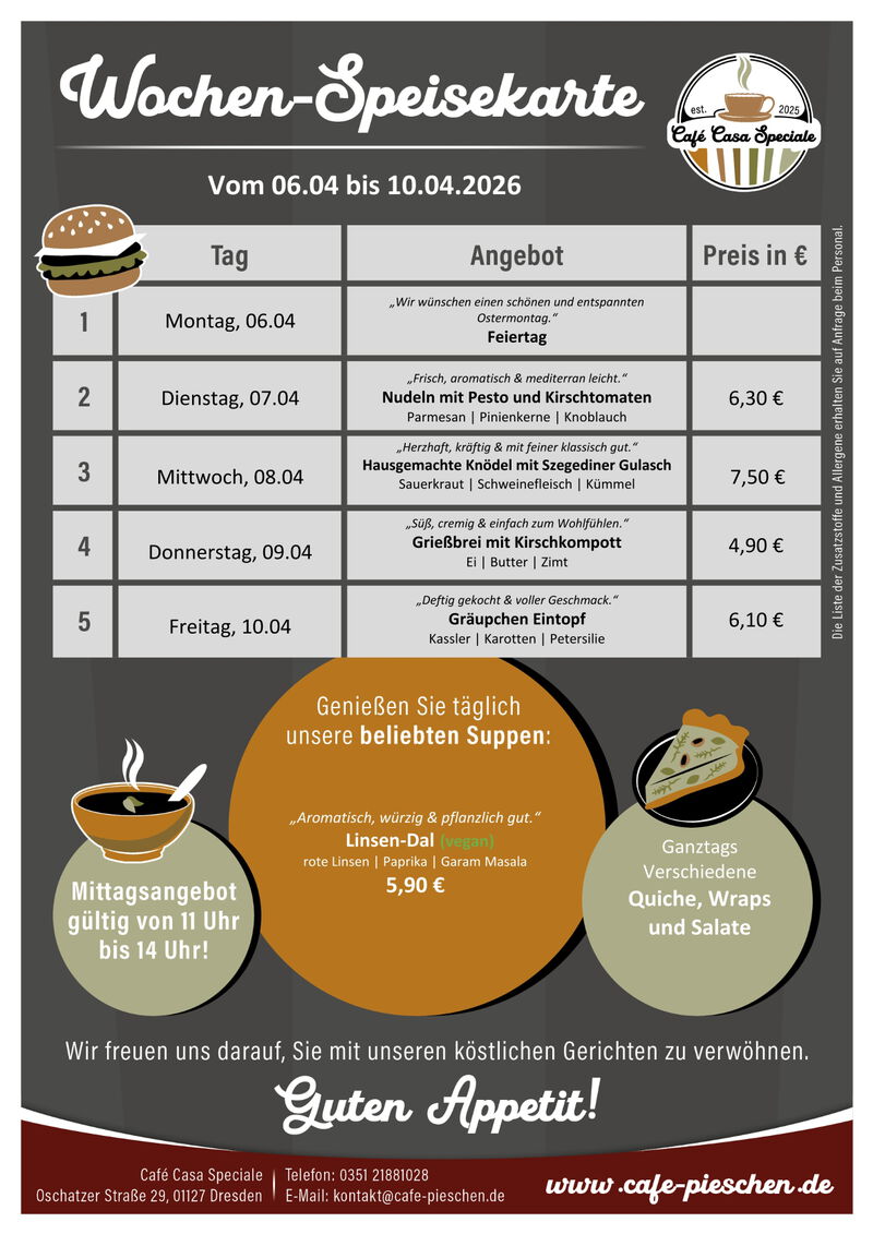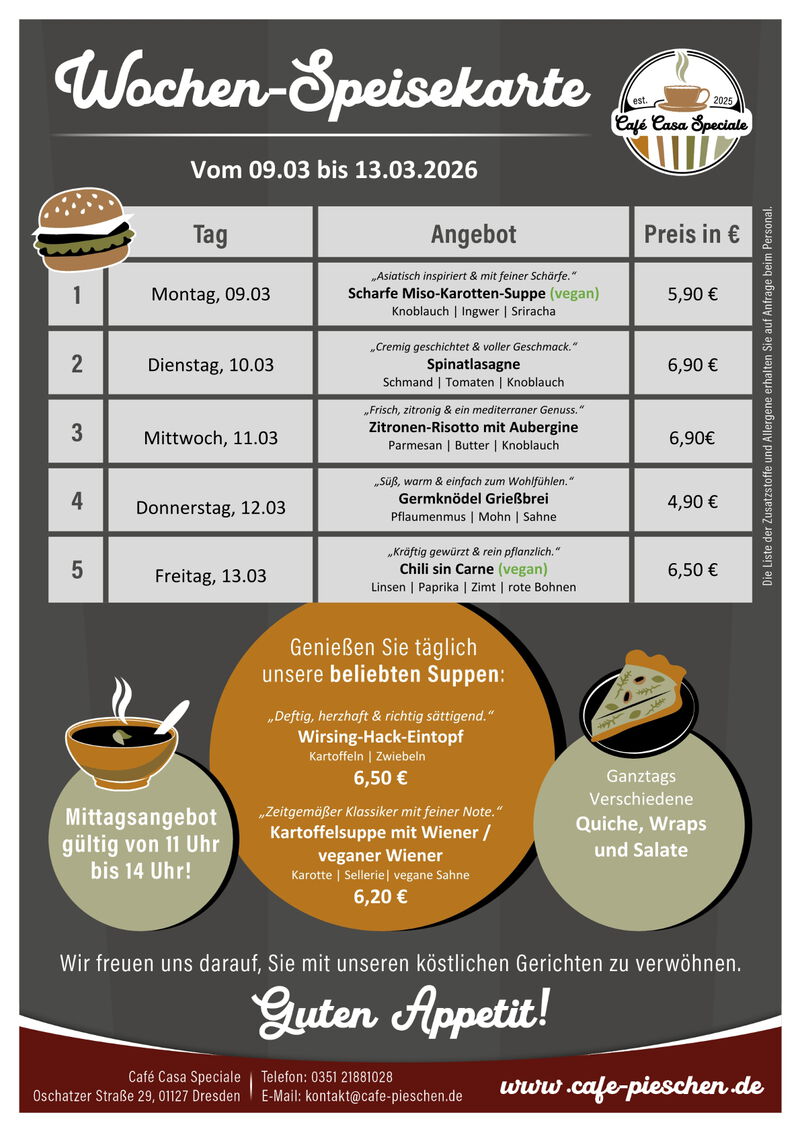 Zum Mittag werden wechselnde Suppen, hausgemachte Quiches, Bowls, Burger und Nudeln angeboten. Salate und Wraps ergänzen unser Angebot. Jeden Dienstag ist Nudeltag, der Donnerstag ist unser "Süßer Tag".