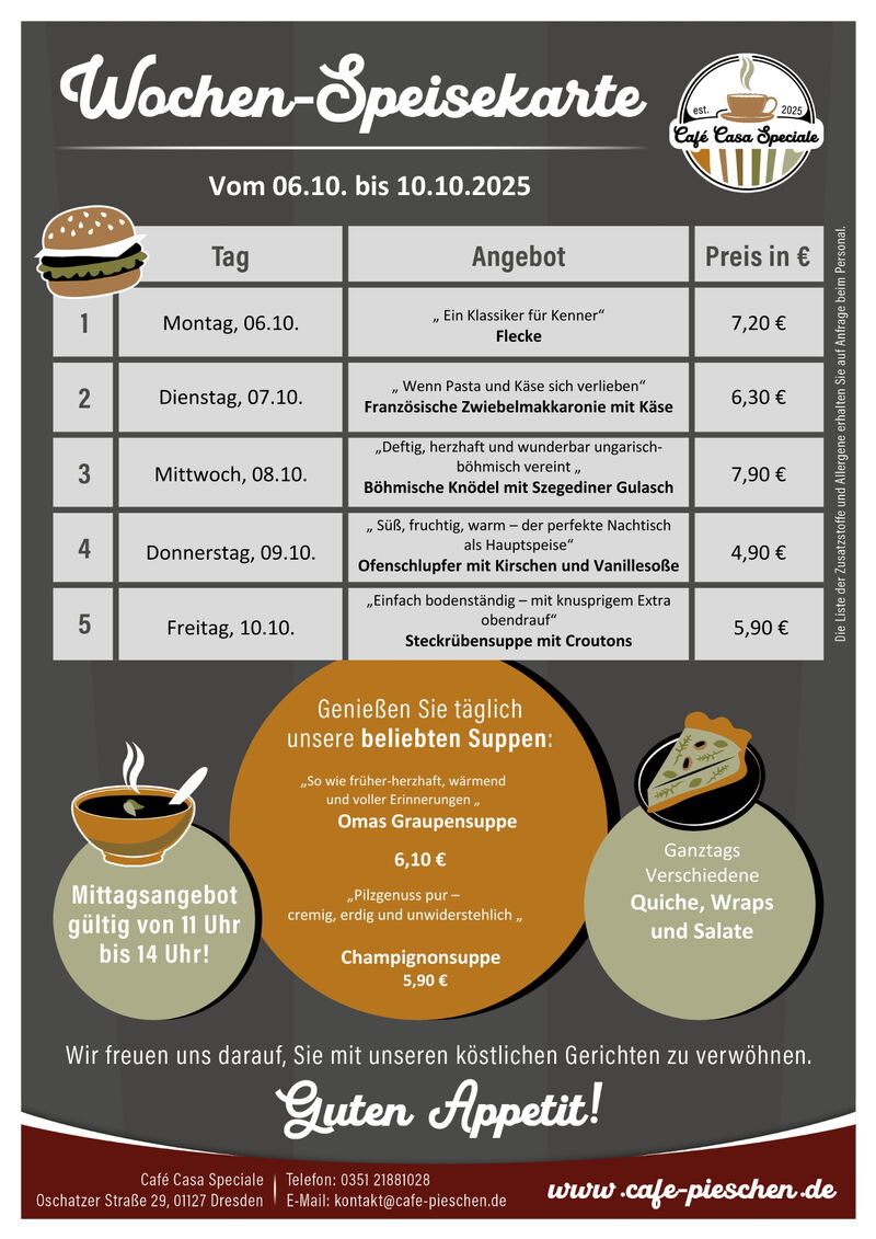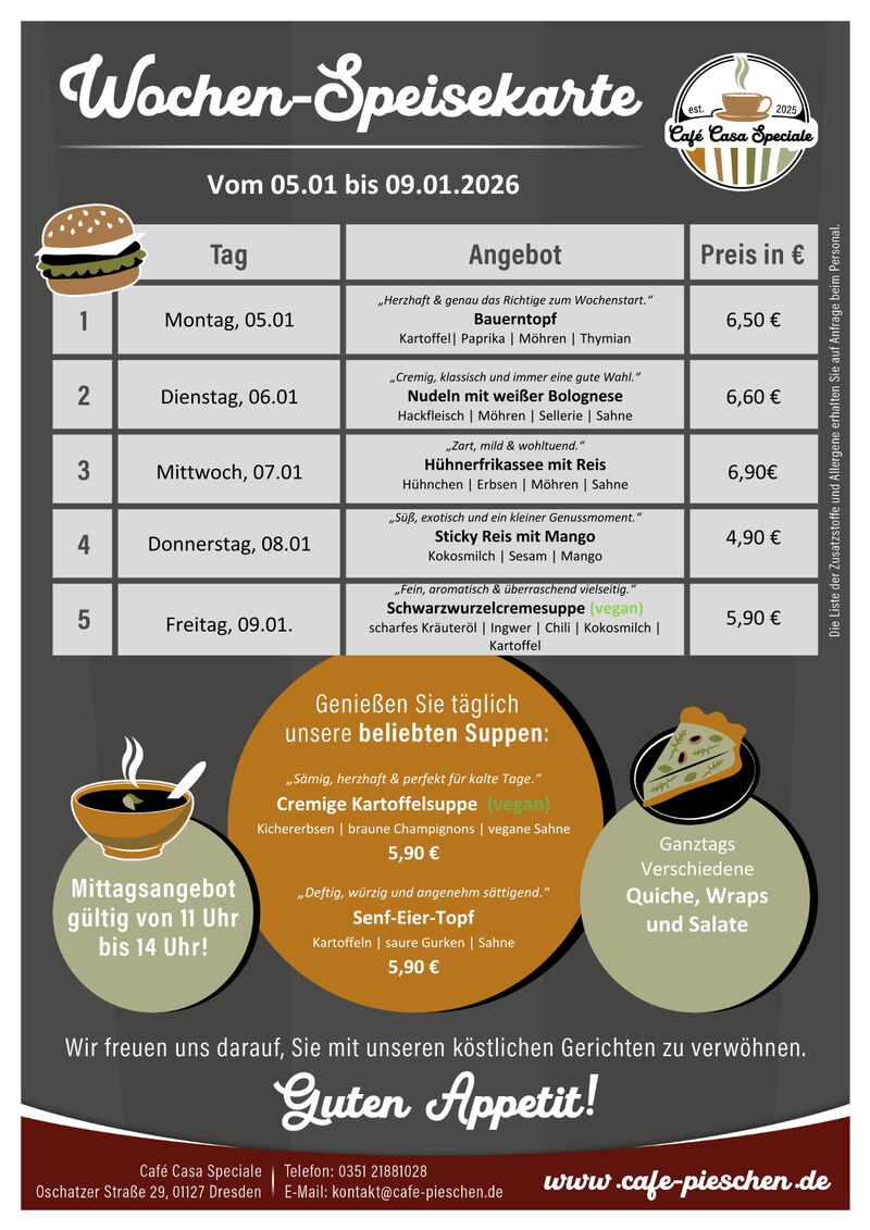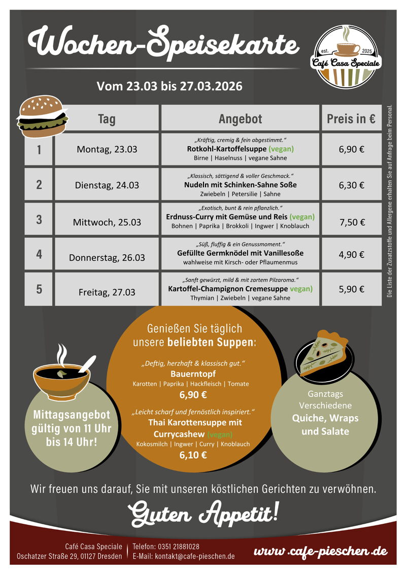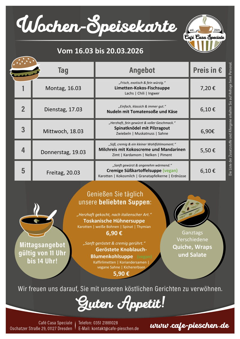 Zum Mittag werden wechselnde Suppen, hausgemachte Quiches, Bowls, Burger und Nudeln angeboten. Salate und Wraps ergänzen unser Angebot. Jeden Dienstag ist Nudeltag, der Donnerstag ist unser "Süßer Tag".