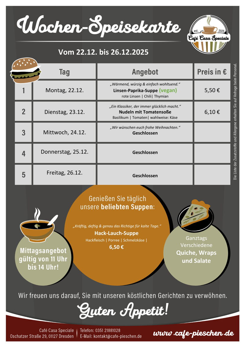 Zum Mittag werden zwischen 11 und 14 Uhr wechselnde Suppen, hausgemachte Quiches, Bowls, Burger und Nudeln angeboten. Salate und Wraps ergänzen unser Angebot.
