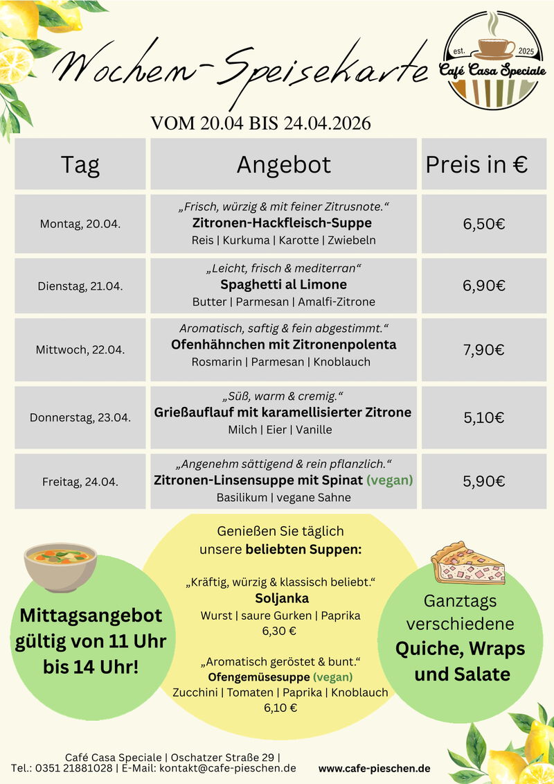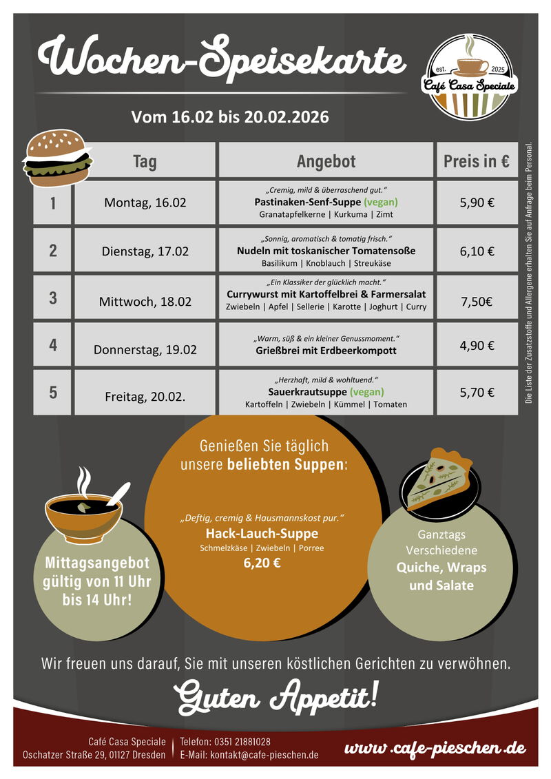 Zum Mittag werden wechselnde Suppen, hausgemachte Quiches, Bowls, Burger und Nudeln angeboten. Salate und Wraps ergänzen unser Angebot. Jeden Dienstag ist Nudeltag, der Donnerstag ist unser "Süßer Tag".